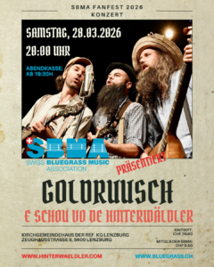 Das Restaurant du Coeur in Basel ist ein soziales Integrationsprojekt, das seit 2017 als Beschäftigungsprogramm für Asylsuchende in den Räumlichkeiten von Soup&Chill agiert. Unter der Leitung von Claudia Adrario de Roche bietet das Team mittags internationale Küche an, oft unter Verwendung von geretteten Lebensmitteln. Das Catering am Abend ist auftragsbezogen – wir freuen uns, dieses Projekt nach dem positiven Echo am 15. SBMA FanFest (in Sissach) wieder mit unserer Bestellung zu unterstützen. - Ab 20:00 Uhr: «Goldruusch» – das Konzert mit der Band die Hinterwäldler – das sind Simon de Roche, Tobias Rechsteiner und Gabriel Kramer, drei Musiker aus dem Aargau, die Bluegrass, Folk und Country auf ihre ganz eigene Art interpretieren. Sie übersetzen amerikanische Klassiker ins Schweizerdeutsche, ohne das Originalgefühl zu verlieren – aus «Banks Of The Ohio» wird «Ufer vom Rhy», aus «Act Naturally» wird «Kino». Mit Gitarre, Banjo, Fiddle, Kontrabass-Balalaika und mehrstimmigem Gesang schaffen sie einen Sound, der handgemacht ist und unter die Haut geht. Über 150 Konzerte seit der Gründung 2017, zwei Alben, eine anstehende Vinylplatte – und ein Bühnenprogramm namens «Goldruusch», das von Auswandern, Goldrausch und Hillbilly-Träumen erzählt. Ein Live-Erlebnis der besonderen Art!