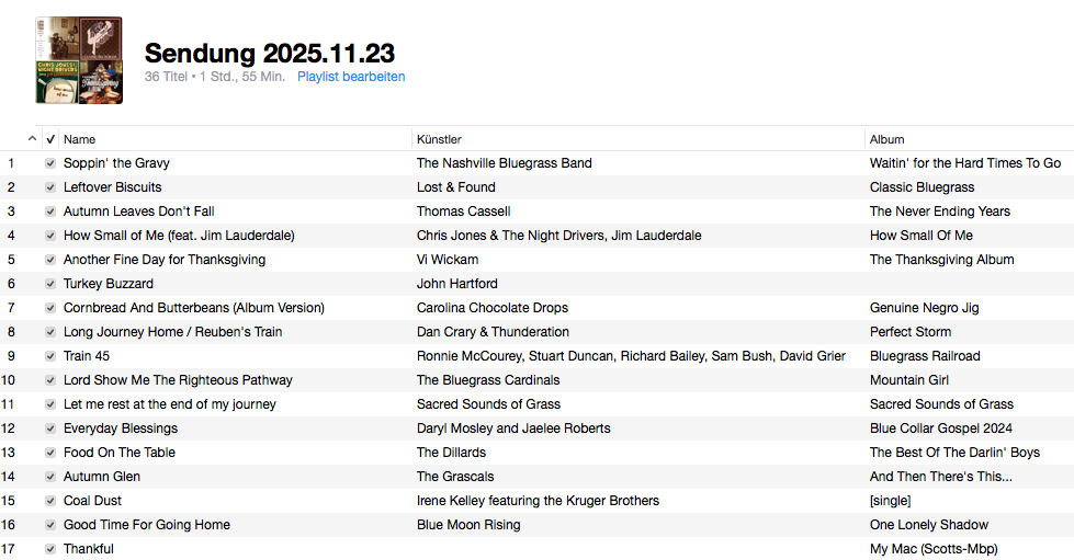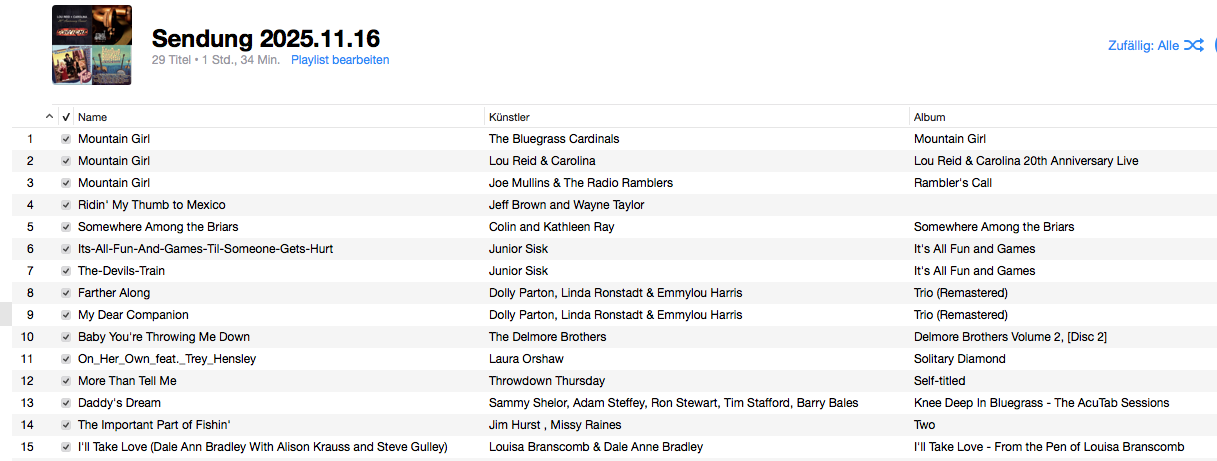 Vielen herzlichen Dank Beat, dass Du die letzten 3 Bluegrass-Shows mit Interpreten und Titel ins Internet gestellt hast und auch in Zukunft zu finden sind. So hat man auch Gelegenheit wenn man einmal die Sendung nicht hören kann. So hat jedermann die Gelegenheit Kent’s wunderbare Sendungen zu hören.
