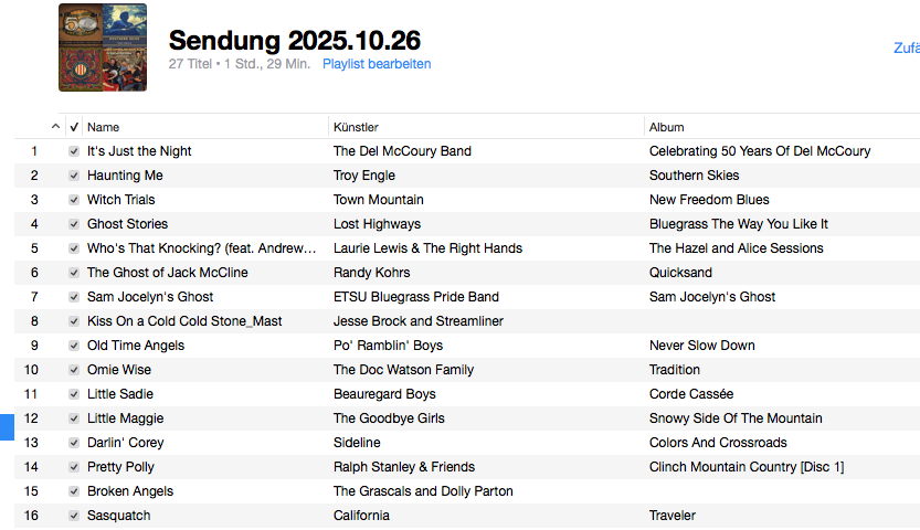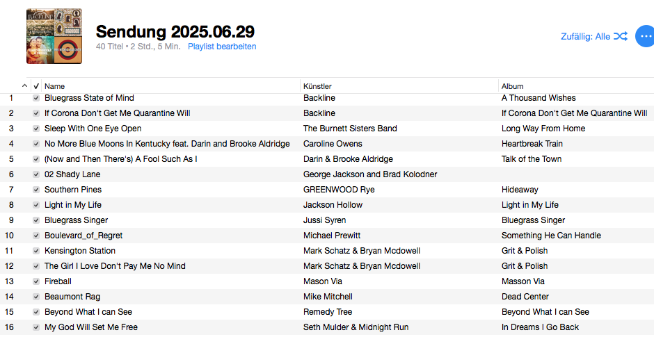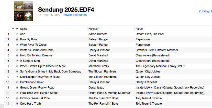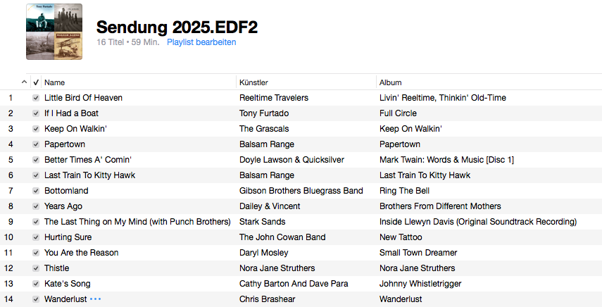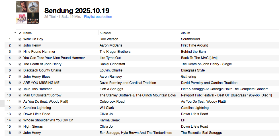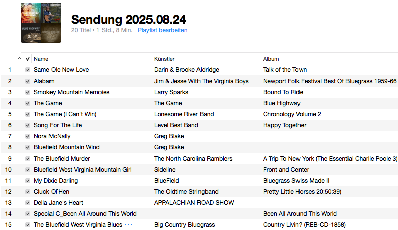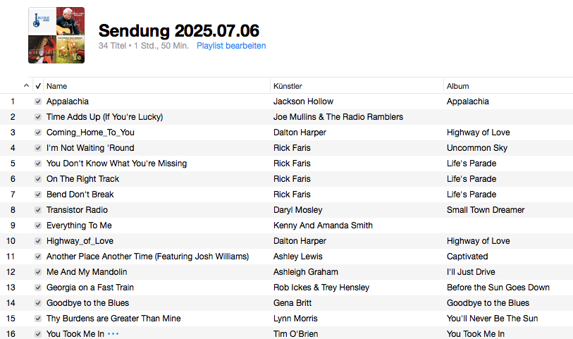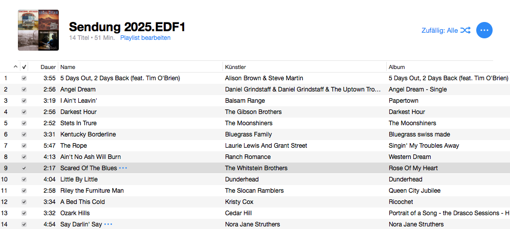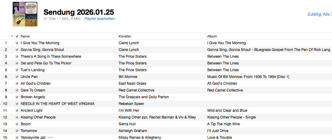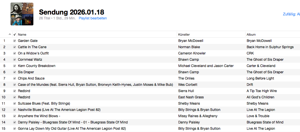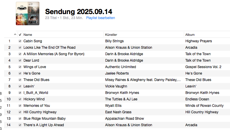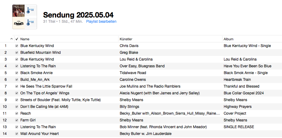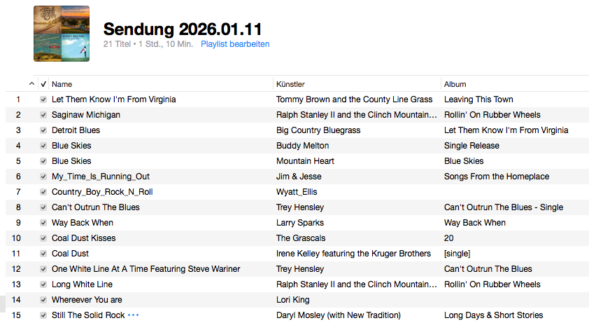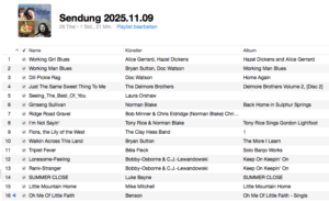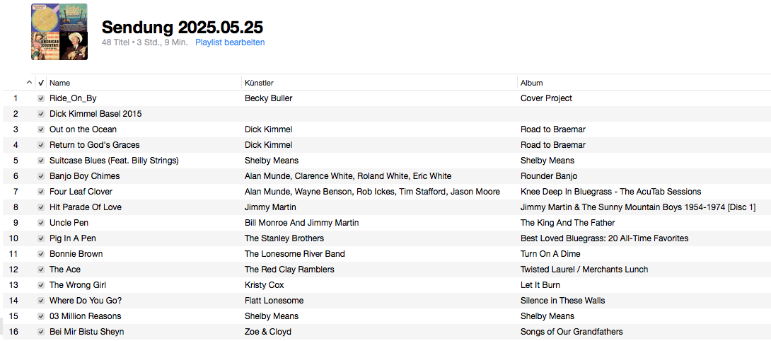 Vielen herzlichen Dank Beat, dass Du die letzten 3 Bluegrass-Shows mit Interpreten und Titel ins Internet gestellt hast und auch in Zukunft zu finden sind. So hat man auch Gelegenheit wenn man einmal die Sendung nicht hören kann. So hat jedermann die Gelegenheit Kent’s wunderbare Sendungen zu hören.