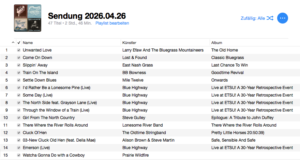 Vielen herzlichen Dank Beat, dass Du die letzten 3 Bluegrass-Shows mit Interpreten und Titel ins Internet gestellt hast und auch in Zukunft zu finden sind. So hat man auch Gelegenheit wenn man einmal die Sendung nicht hören kann. So hat jedermann die Gelegenheit Kent’s wunderbare Sendungen zu hören.