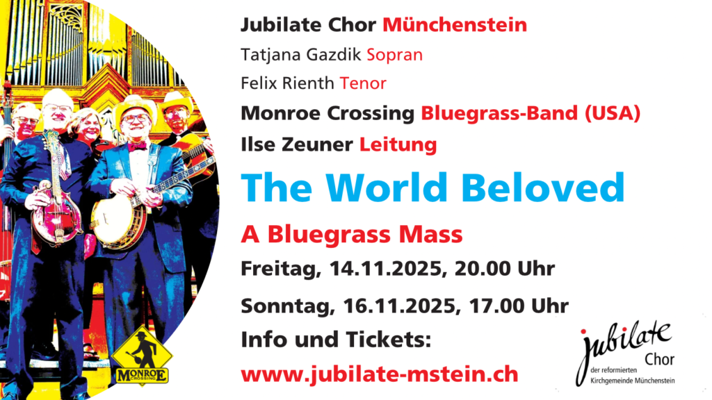 Am 14. & 16. November 2025 erklingt in der reformierten Kirche Münchenstein ein aussergewöhnliches Konzert: Der Jubilate Chor unter der Leitung von Ilse Zeuner präsentiert The World Beloved – A Bluegrass Mass von Carol Barnett und Marisha Chamberlain – erstmals in Europa.