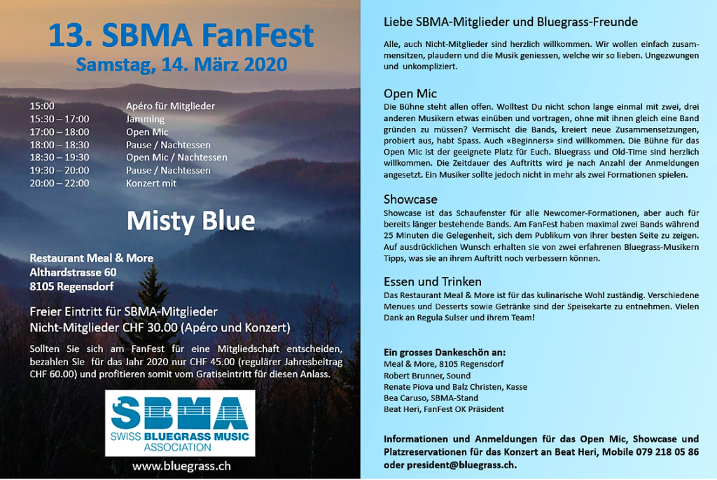 Das Erbe des legendären Spring Bluegrass Festival Willisau blüht in neuen Farben weiter, bunter denn je. Nach dem Erfolg des Bluegrass Jamboree im Dezember 2019 steigt am Freitag, 15. Mai 2020 ein wahres Bluegrass-Fest. Gleich drei Bands bieten abwechslungsreiche Klänge in der weiten Welt der Bluegrass-Musik.